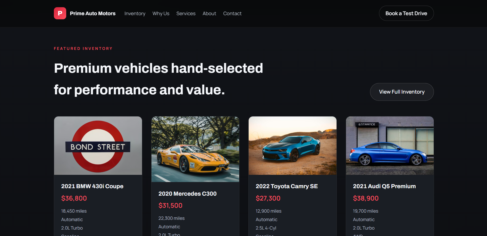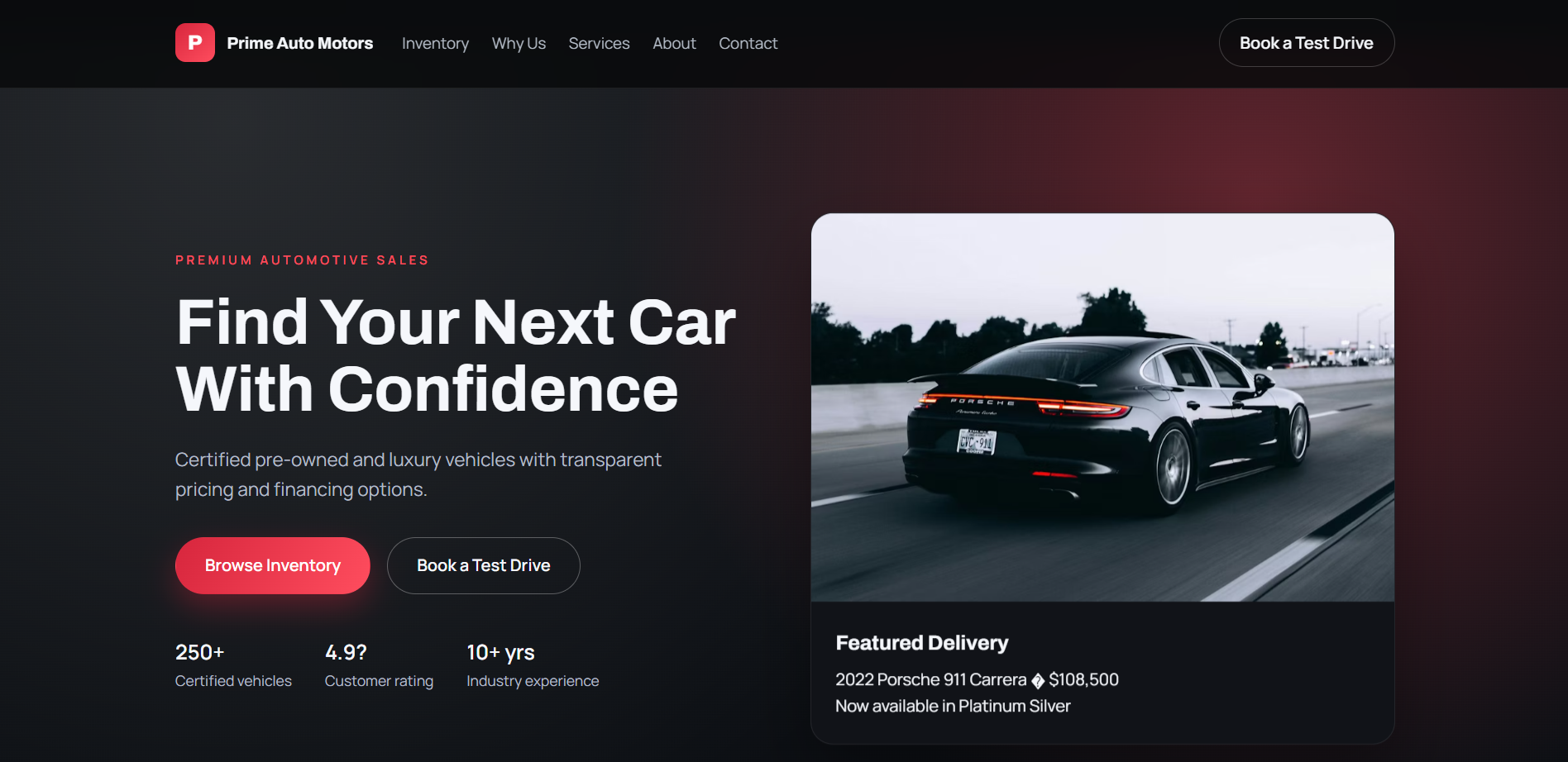 I build this website for a car dealer company using HTML, CSS and JS a beautiful red and dark landing page. Check the Demo url to visit the website